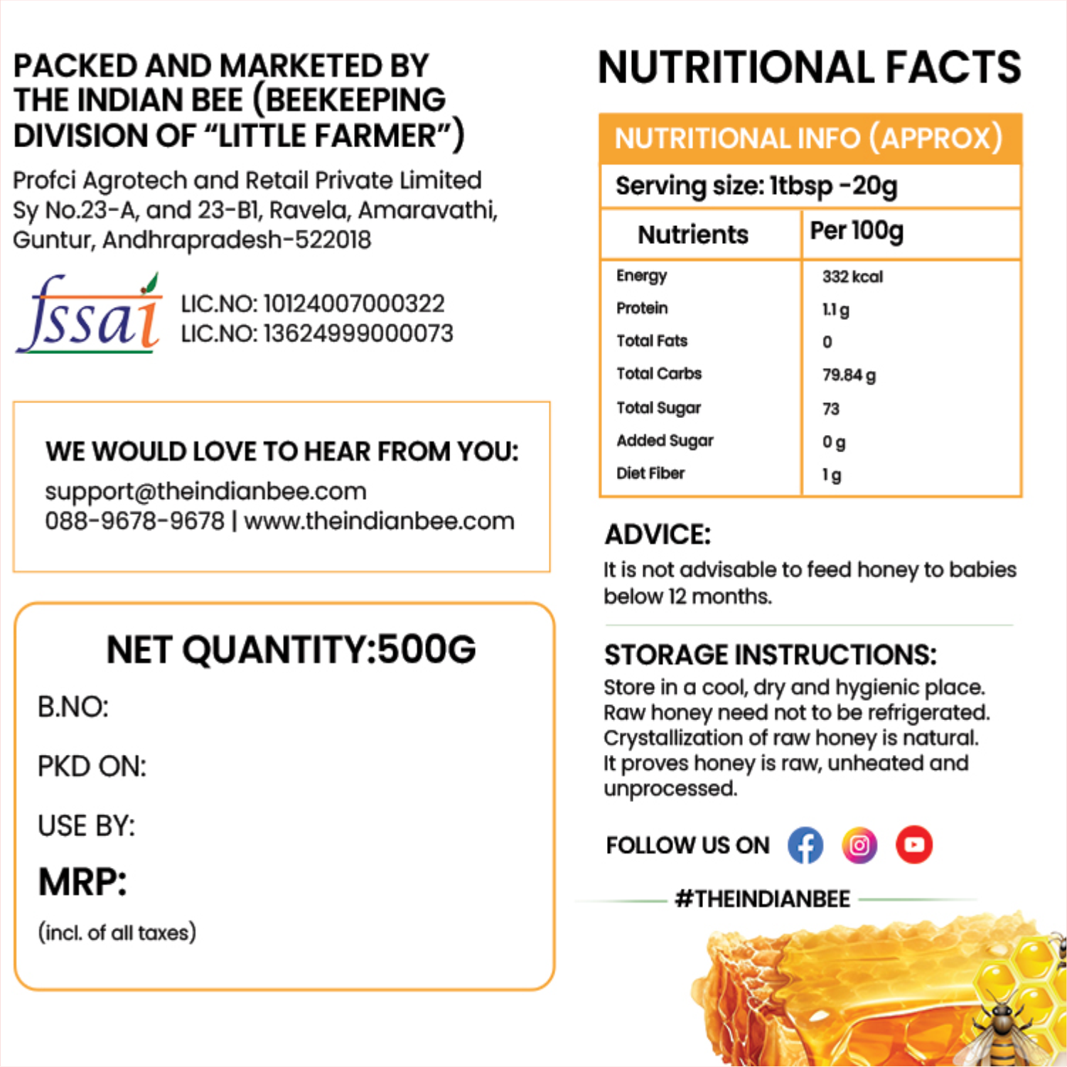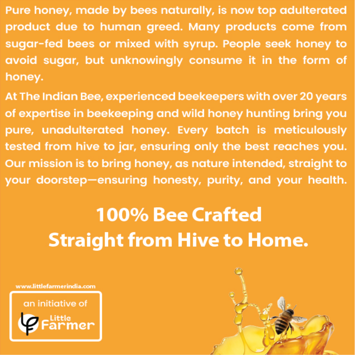 Sourced from pristine forests and diverse floral landscapes, The Indian Bee Multiflora Honey is a rich blend of nectar collected by bees from a variety of wildflowers and medicinal plants. This diverse floral origin gives it a unique depth of flavor, natural goodness, and therapeutic properties. Unprocessed, unfiltered, and free from any additives, our Multiflora Honey is as pure as nature intended.